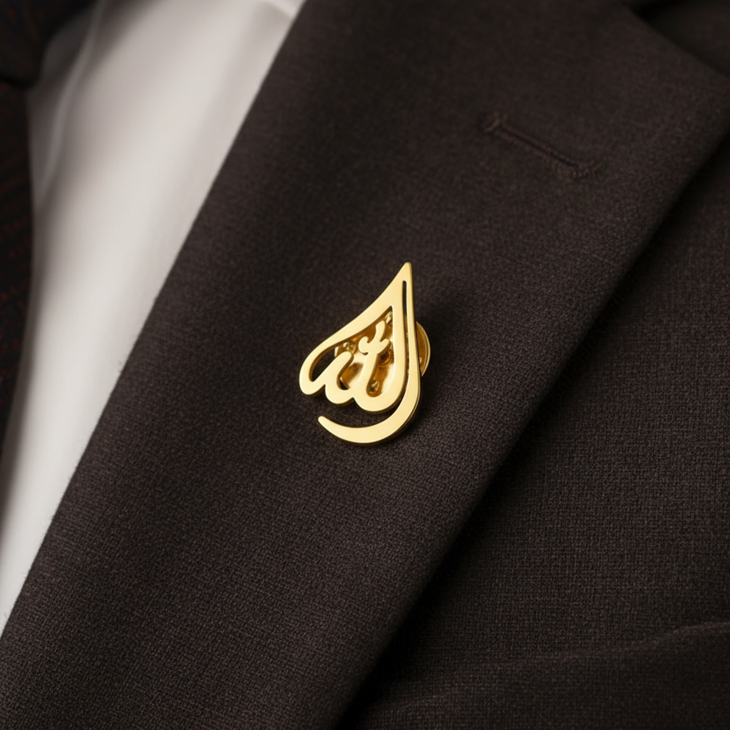 Elevate your attire with this elegant pin featuring the name of Allah in a graceful calligraphy style. Thoughtfully crafted into a brooch, it makes a meaningful and timeless gift. Though small in size, its refined design ensures it remains beautifully visible and eye-catching. Perfect for the lapel of a jacket or delicately pinned to the corner of a hijab—this piece adds a touch of devotion and beauty to any outfit. Comes in two colors